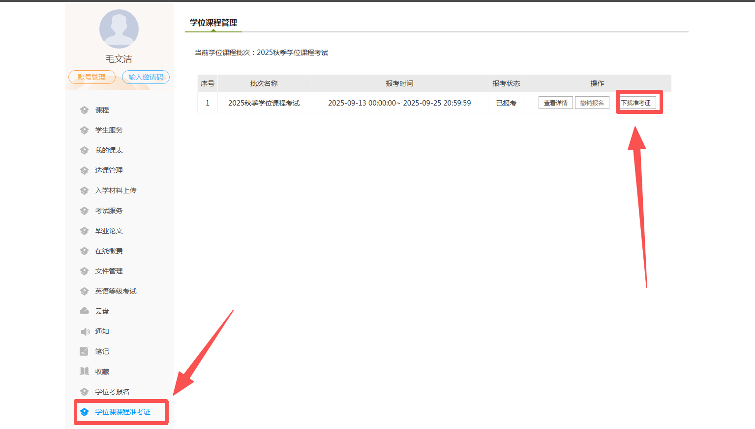 第二步:在登录后的首页----点击左侧学位课课程准考证----下载准考证,如下图:
