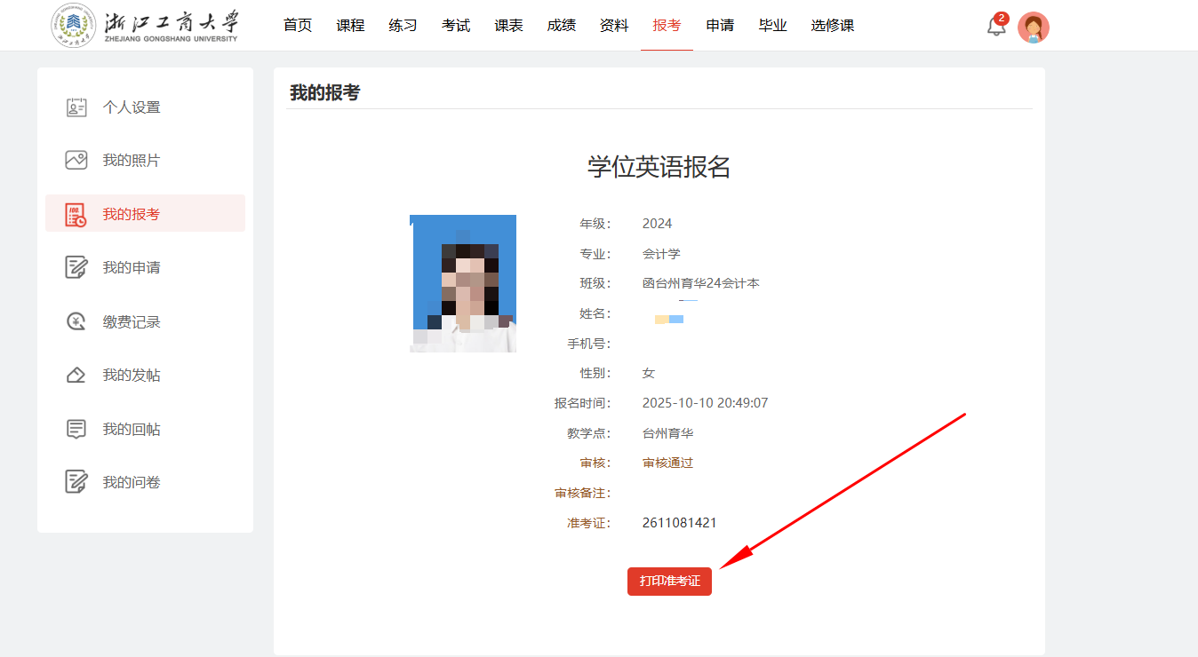 学生打印准考证方法:网页端口登录麦能网学习平台--点击【报考】--点击【查看详情】--点击【报名详情】--点击【我的报考】--点击【打印准考证】--点击【打印】--可以存为pdf格式后再打印,如若连接着打印机也可以直接打印,如下图: