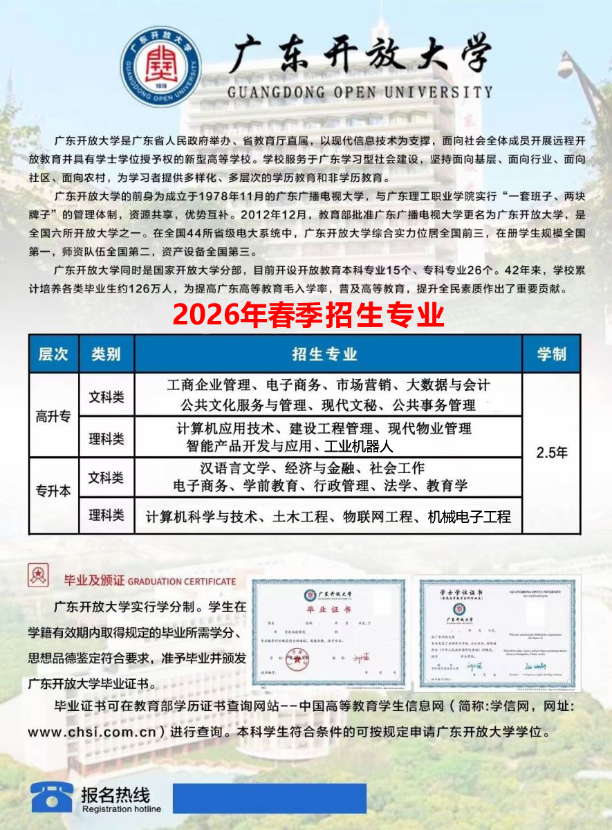 广东开放大学是以现代信息技术为支撑,面向社会全体成员开展开放教育并具有学士学位授予权的省属正厅级本科新型高校。学校前身是创建于1978年的广东广播电视大学,1988年创办广东广播电视大学附属中等职业技术学校,2005年创办广东理工职业学院,2010年纳入国家“探索开放大学建设模式”教育体制改革试点,2012年更为现名,2019年获批广东老年大学,2021年入选广东高等教育“强特色”建设高校和省域高水平高职院校建设计划建设单位,2022年与广东省理工职业技术学校实施“集团办学”。学校是广东终身教育学分银行、广东省1+X证书制度试点工作办公室落户单位,获批为广东省博士工作站,是省依法治校示范校、省绿色学校。