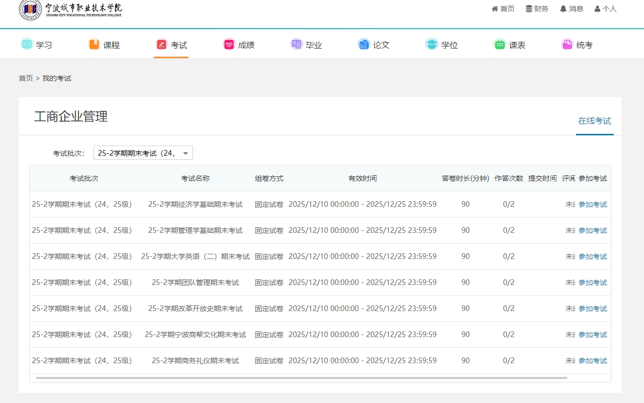 宁波城市职业技术学院高等学历教育2025年12月期末考试(在线机考)安排表