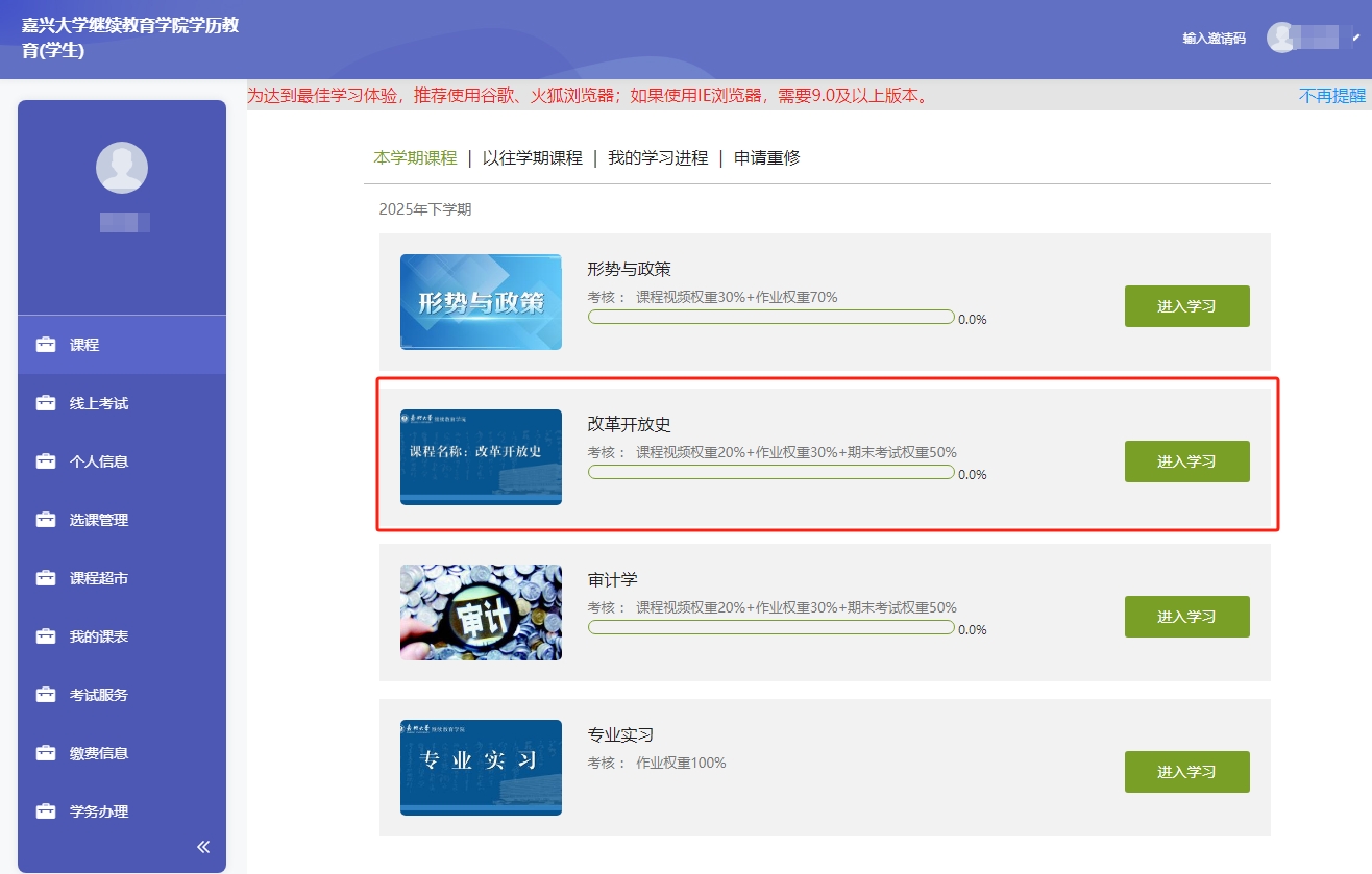 嘉兴大学成人教育2025级(第二学期)在线学习一览表 |