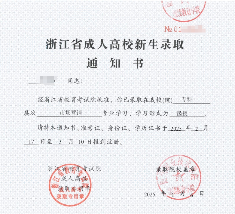 祝贺你!经浙江省教育考试院批准,你已被衢州职业技术学院录取为高等学历继续教育2025级新生。你收到《录取通知书》,只表明取得了入学资格,新生必须报到并缴费,经衢州职业技术学院继续教育学院入学资格复查合格,并经教育部学信网上新生学籍电子注册才取得正式学籍。如你在规定时间内学完所读专业人才培养方案规定的全部课程,成绩合格,颁发衢州职业技术学院成人高等教育毕业证书,毕业证书进行学信网电子注册,国家承认学历,并享受与普通高校同等学历毕业生待遇,可报考专业技术职务、公务员及本科等(具体以当年当地政策为准)。为做好 2025年新生报到入学工作,现将有关事项通知如下: