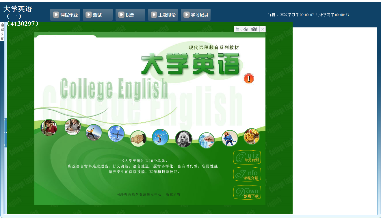 5. 课件界面如图,可以进行课程作业、测试、投票、主题讨论和学习记录等操作