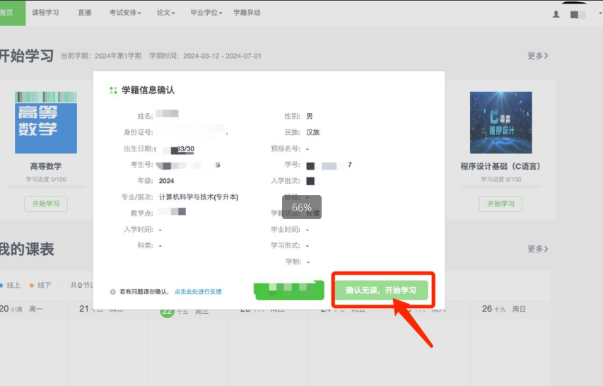 第二步:输入账号和密码登录,绑定手机号,登录后点击所在院校进入“首页”界面,核对确认首页学籍信息。如下图: