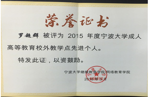 受宁波大学副校长徐铁峰教授委托,学校继续教育与培训处处长马敬峰代表学校对前来参加会议的教学点老师表示热烈欢迎和衷心感谢,并向大家简要介绍了宁波大学和宁波大学成人高等教育2015年的有关情况,希望大家积极进取,以教学质量作为生存之基,以品牌特色和优质服务作为发展之源,规范办学,创新教学模式,提高教学质量,使宁波大学成人高等教育成为浙江乃至全国的一个品牌。学院院长王存宽教授作工作报告。王院长回顾了一年来学院的工作情况,分析了当前成人高等教育面临的困难和发展机遇,提出了学院和教学点下一步的工作目标和发展方向,希望和教学点一起努力,共同做强做大宁波大学成人高等教育,共同维护宁波大学成人高等教育的品牌和荣誉。学校计划财务处副处长翁光聪就学校有关财务管理规定和要求作了说明。继续教育学院党总支书记袁虹宣读了宁波大学成人高等教育2015年度校外教学点先进个人表彰文件,对获得宁波大学成人高等教育特别贡献奖的胡运昌等5位教学点负责人和邵燕红等46位教学点先进个人进行了表彰。 我校罗超群同志荣获2015年度宁波大学成人高等教育校外教学点先进个人。
