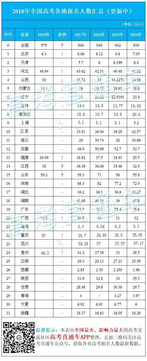 目前各省2018高考报名人数还未全部公布,已有北京、河北、山西、江西、重庆、贵州、山东等省市公布2018高考报名人数。其中,山东59.2万人,去年58.3万多人,相比去年人数增加近万人,居全国第三。根据往年数据统计,预计今年高考人数最多的仍是河南省,其次是广东省,这三个省的同学,真是压力巨大啊!详见下表: