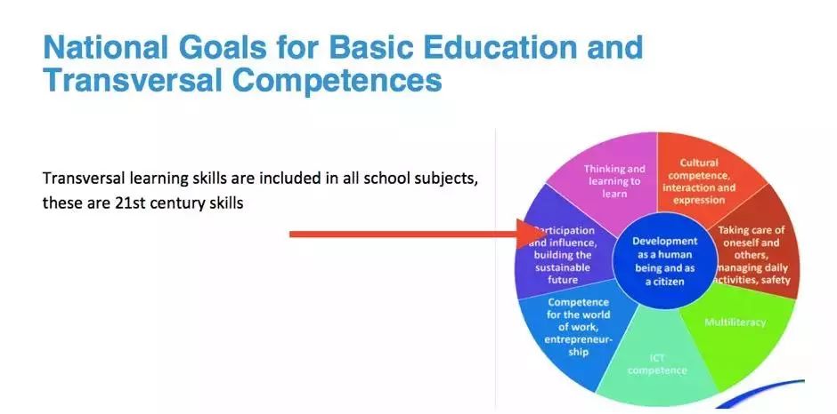 ▲ 图里提到的 7 大横贯能力分别为:思考与学会学习的能力;文化感知、互动沟通与自我表达能力;照顾自己,照顾他人,安排日常生活和安全的能力;多元识读;信息技术能力;职业技能与创业精神;参与、影响并构建可持续性未来的能力。