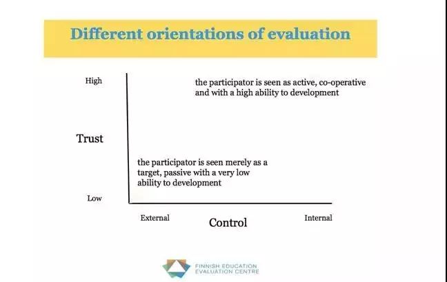 ▲ 芬兰国际教育评估中心的老师分享图,横轴是“控制”, 一端是“外部控制”,另一端是“内部控制”;纵轴是“信任”,上面是“高”,下面是“低”。 他们认为最好的教育评估基于高度信任,是依靠组织的内部评估,所以芬兰的教育评估在右上角。