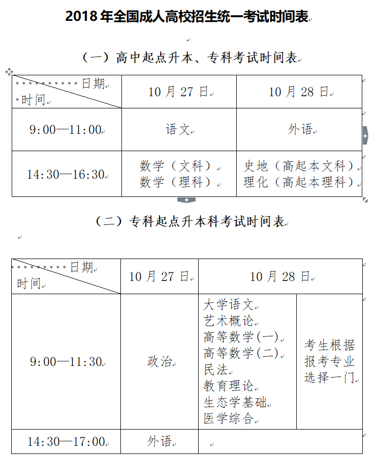 2018年全国成人高校招生统一考试时间表