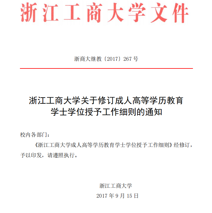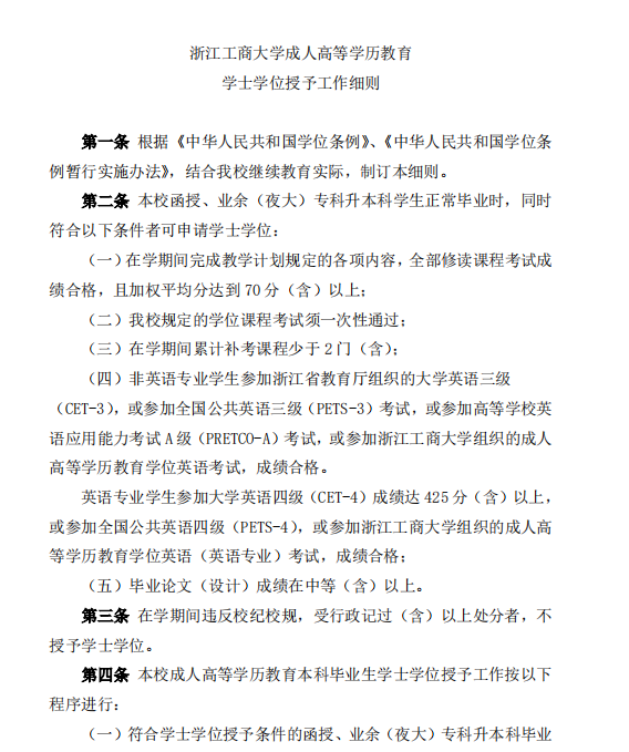 浙江工商大学关于修订成人高等学历教育 学士学位授予工作细则的通知