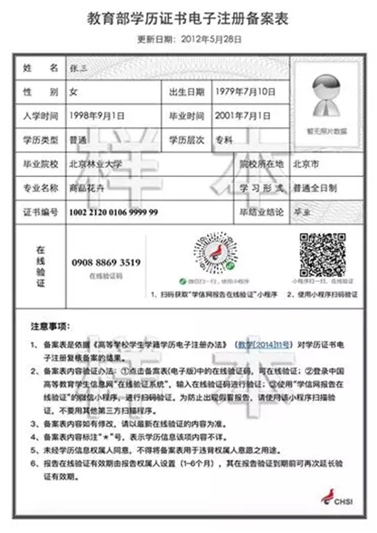 3.专升本的考生须同时提供教育部审定核准的国民教育系列高等学校或高等教育自学考试机构颁发的专科毕业证书、本科结业证书或以上毕业证书。若毕业证书遗失,须提供中国高等教育学生信息网(http://www.chsi.com.cn)上查询到的本人《教育部学历证书电子注册备案表》打印件(见附件2样表)。