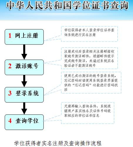 完成实名注册成功后系统将进行验证,并将验证结果发送至您注册的电子邮箱,请注册后 24 小时内登陆填写的个人电子邮箱进行账号激活操作。注意:注册后 24 小时不激活账号者,系统将自动清除注册的信息;注册信息验证未通过的,请根据邮件提示进行咨询,系统将于注册后 2 小时自动清除验证未通过的注册信息。注册成功并通过系统实名验证之后,系统将根据注册填写的姓名及身份证件号码,自动获取在本系统查询范围内获得的多个学位证书信息。