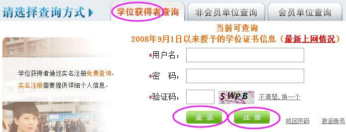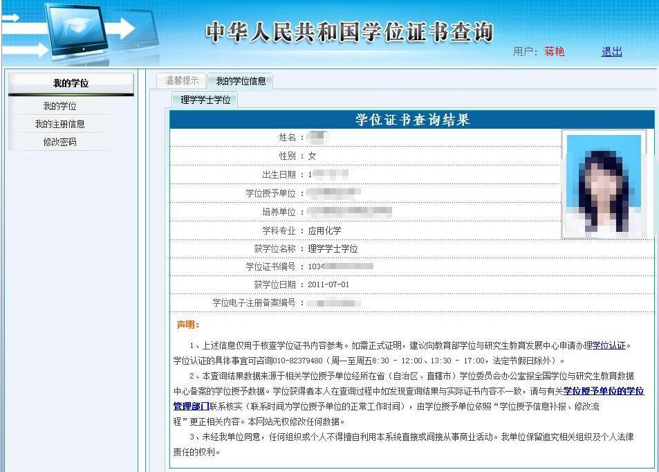 3、回到“学位在线”:“学位获得者查询”页面,用已激活的账号“登录” 学位证书查询系统,就显示你的学位查询结果了查询结果如下: