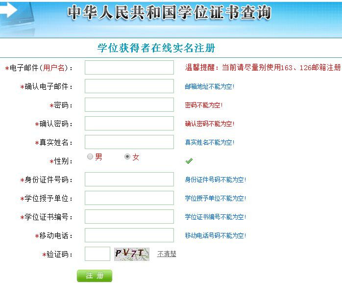 所注册的个人信息必须真实、准确;一个电子邮箱只可在系统中注册一次一个身份证件号码可在系统中注册多次,但需保证其每次注册的电子邮件地址不同。注册时除个人基本信息需真实填写外,还需要填写对应的“学位授予单位” 和“学位证书编号”。