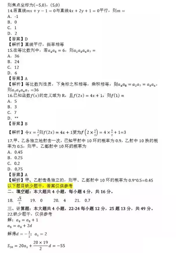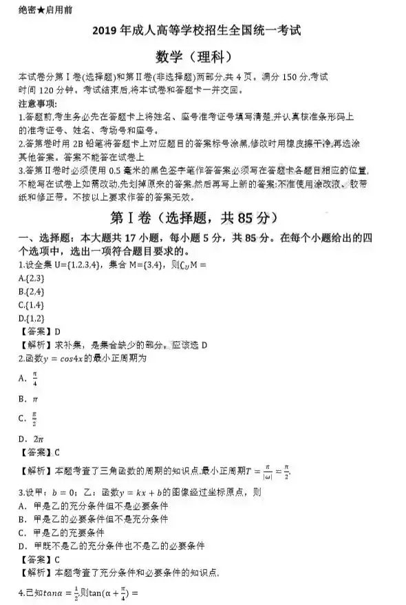 2019年成人高考高起专[数学(理)]真题及答案核对(陆续更新)