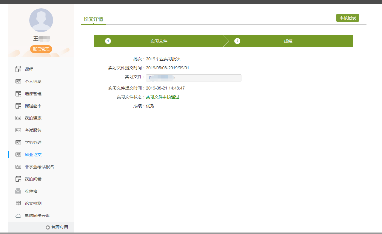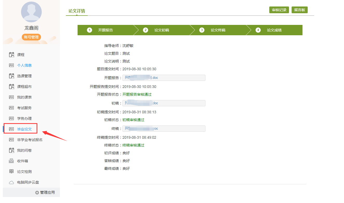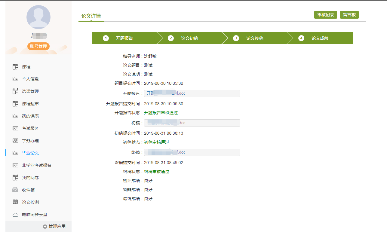 注:点击右上方“审核记录”可查看论文审核记录;点击“留言板”可给指导教师留言,并查看教师留言。