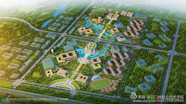 大学城新校区以“仰韶故里,文明再续;黄河西湾,技扬三地”为主题,形成“两心南北分居,两轴十字汇聚,一谷树形生长,三片南北贯通”的规划结构。