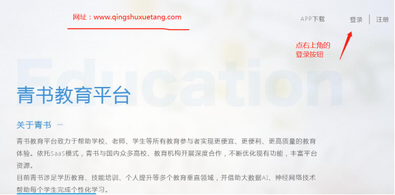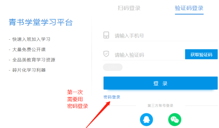 浏览器输入网址:http://www.qingshuxuetang.com,然后点击右上角“登录”,点击密码登录,输入账号和密码登录。
