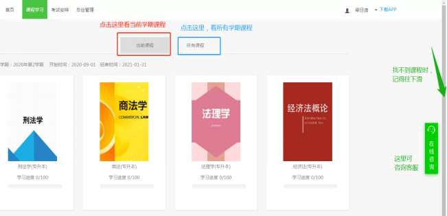 学生登录后在“首页”就能看到当前学期的课程,如首页里没有内容,点击“课程学习”,“所有课程”,即可看到课程(下图所示)