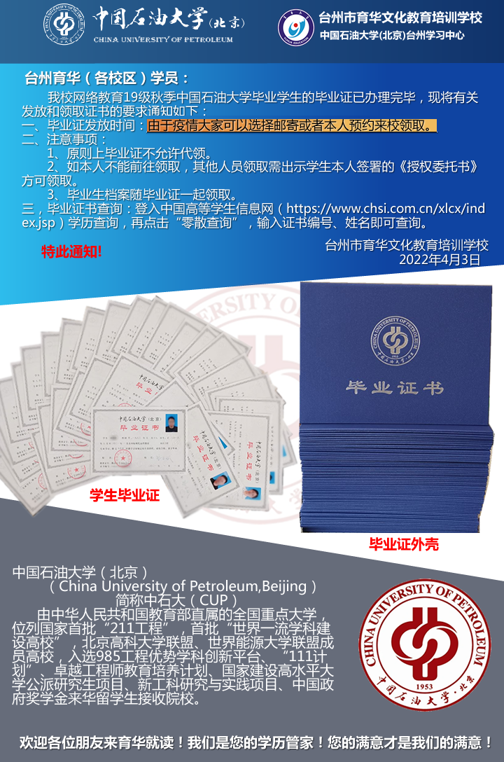 关于领取中国石油大学19级秋季网络教育毕业证书的通知