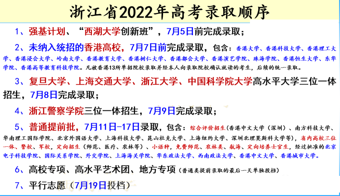 浙江大学、复旦大学、上海交通大学、中国科学院大学四所高校三位一体招生,接着进行军队、公安、定向招生、地方属院校三位一体综合评价招生,及经过批准的国际关系学院等院校、航海类等专业的提前录取传统志愿投档和录取;其中,提前录取一段投档录取完成后,进行高校专项计划、高水平艺术团、高水平运动队、地方专项计划等特殊类型招生投档和录取。