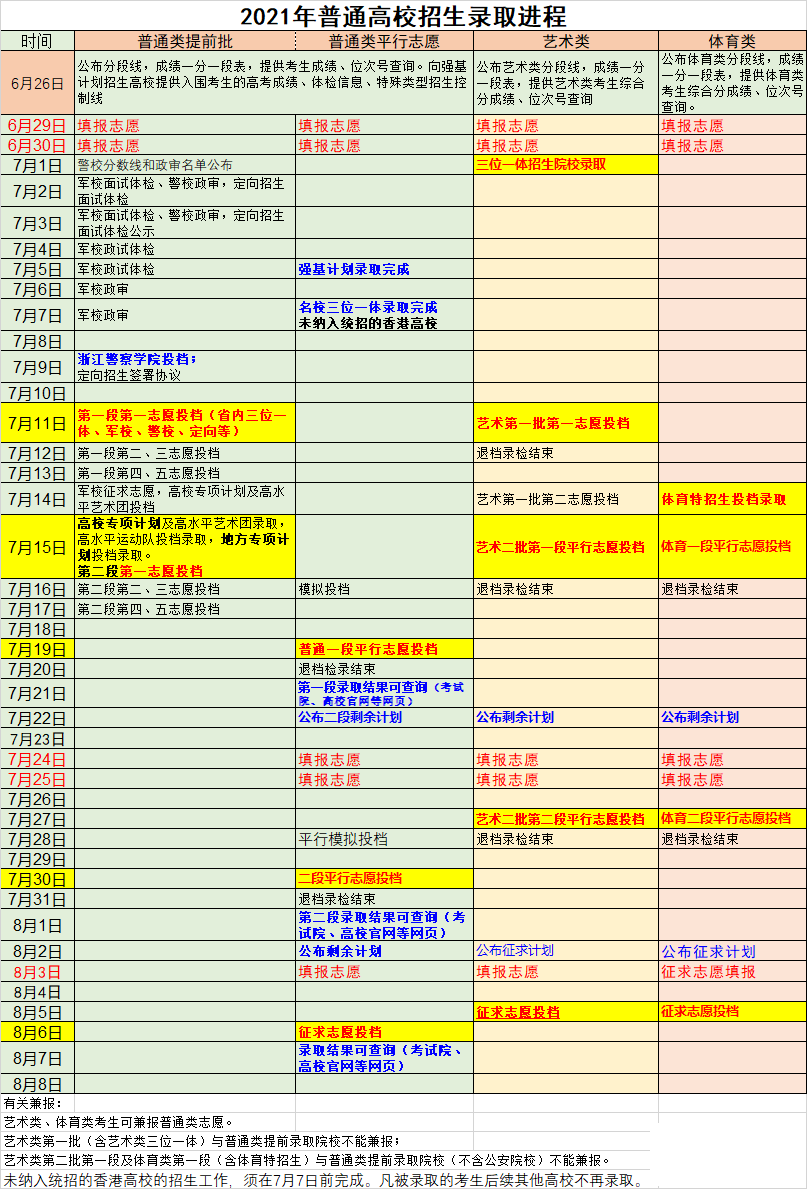 答:普通类提前录取和第一段、艺术类第一批(含艺术类三位一体招生)和第二批第一段、体育类第一段同时填报志愿,填报时间为6月29-30日;普通类第二段、艺术类第二批第二段和体育类第二段同时填报志愿,填报时间为7月24-25日(2021年时间)。