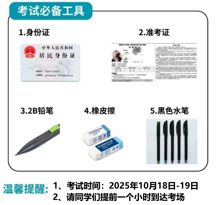 考试时请带好①身份证原件、②成考准考证、③2B铅笔(铅笔请提前削好,用于涂卡)、④橡皮1块、⑤0.5毫米及以上黑色水笔2支,数学考试时可使用计算器,但不得互相借用,具体情况可以当场咨询考场监考老师,以监考老师的要求为准。