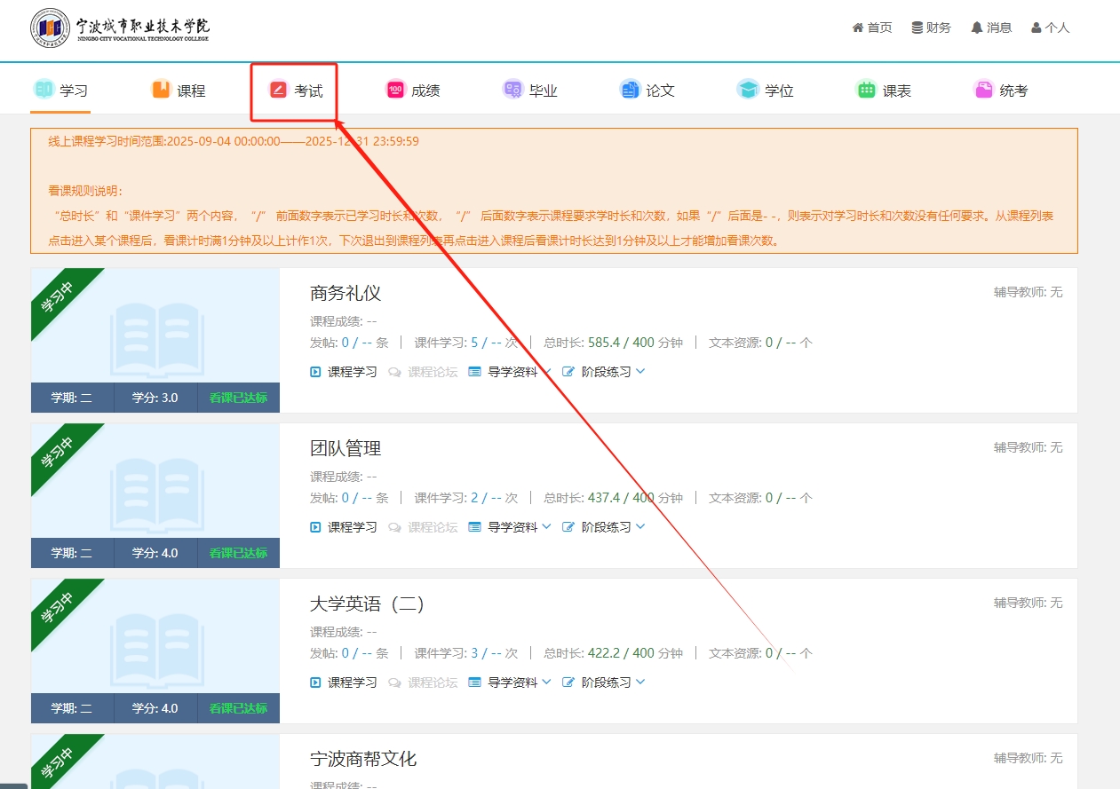 根据宁波城市职业技术学院继续教育学院2025年下半学期的教学计划课程安排,现将本学期期末考试有关工作通知如下: