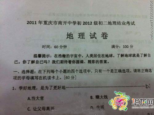 到底是真是假?今日中午,记者联系上最初发微博的网友“猥仙”,这名叫董浩的男孩是南开中学高2012届的毕业生。董浩称,这张截图是他在同学空间里看到的,“听说是我们学校的地理老师王磊(化名)出的,觉得很有意思,就传上来了。”董浩说,在他看来,这道题目出的很好,“很积极很正面,当然,确实也‘碉堡’了!”