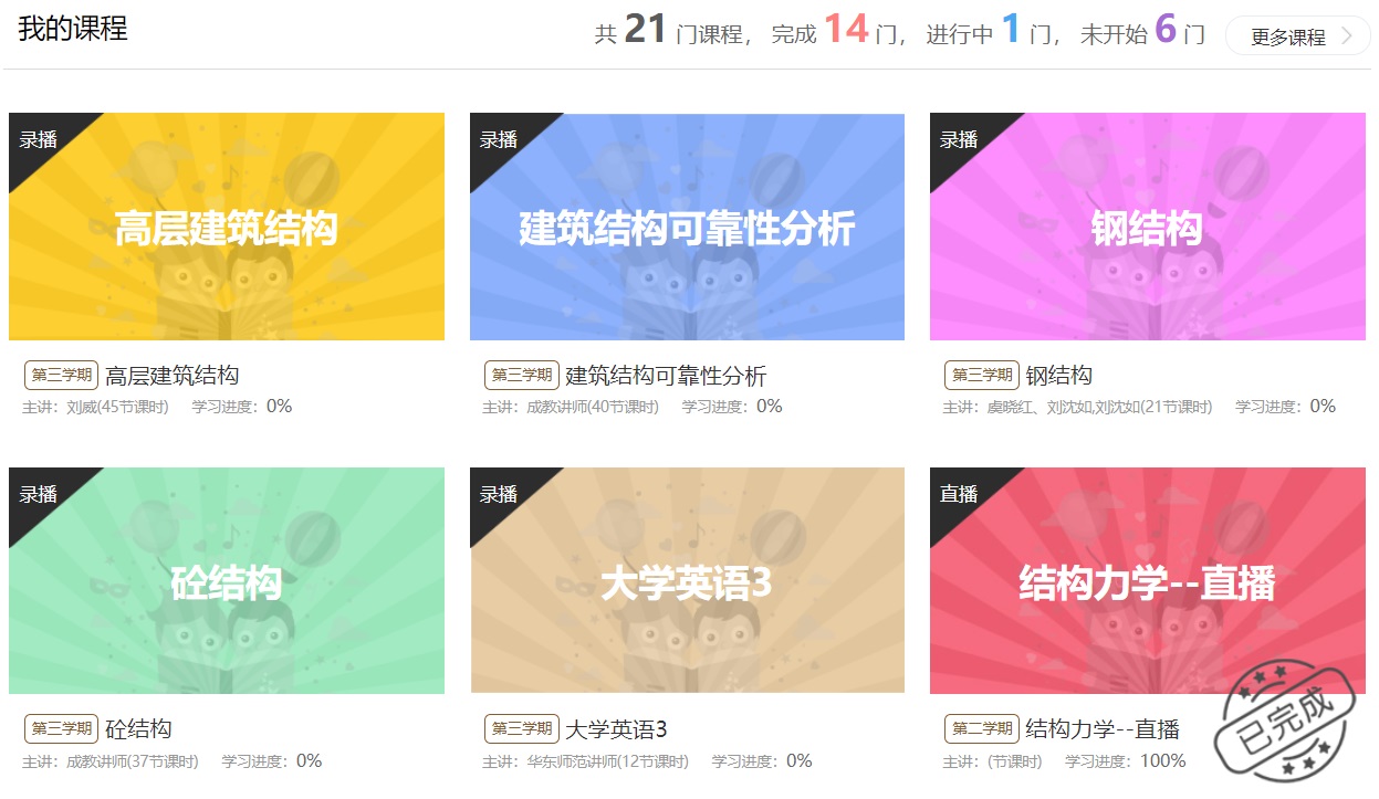 1)我的课程里可在列表中选择学习的课程,还可以显示学习进度和总学习时长。也可以直接在首页点击课程,选择对应的学期进行学习;