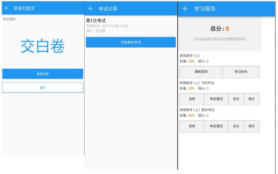 试卷提交后可查看答卷,点击考试记录可以继续之前的考试,继续作答点击右上角小图标,可查看学习报告