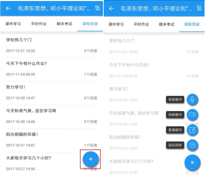 课程答疑,可与老师进行互动,。点击右下角按钮,可语音提问,视频提问、普通提问以及返回顶部,如下图所示: