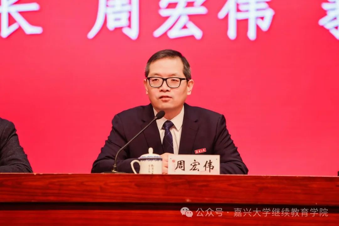 周宏伟对2024级各位新同学的到来表示热烈的欢迎和衷心地祝贺,并简要介绍了学校的办学经历和办学特色。学校深入贯彻习近平总书记重要指示精神,大力弘扬伟大建党精神、红船精神,全面服务国家战略实施与区域经济社会发展,持续推进特色发展、创新发展。他希望同学们牢记学校“方正为人 勤慎治学”的校训,践行“求是求真求正”校风,寄语大家通过在校学习,熟练掌握各种技能,在学校和工作单位将“嘉大人”的独特精神气质薪火相传。