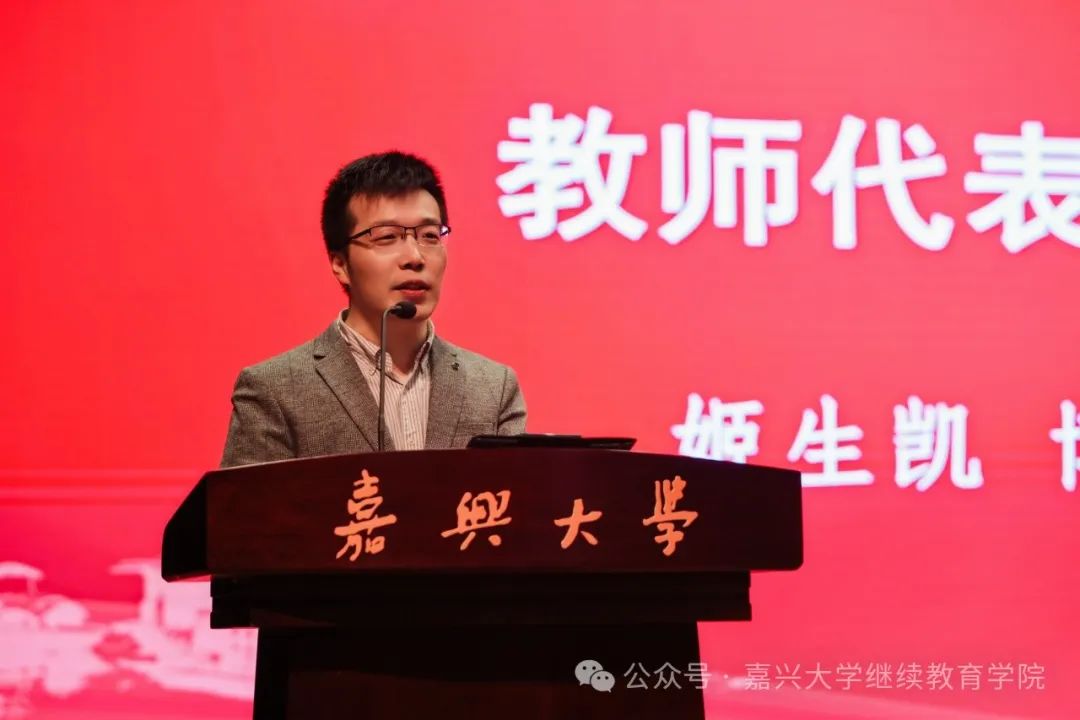 教师代表、师范学院姬生凯博士,老生代表、2023级小学教育专业张敏,新生代表、2024级法学专业娄加东,校友代表、96届工业会计专业孙庆华(庆华姐姐,嘉兴名主持)在典礼上发言。