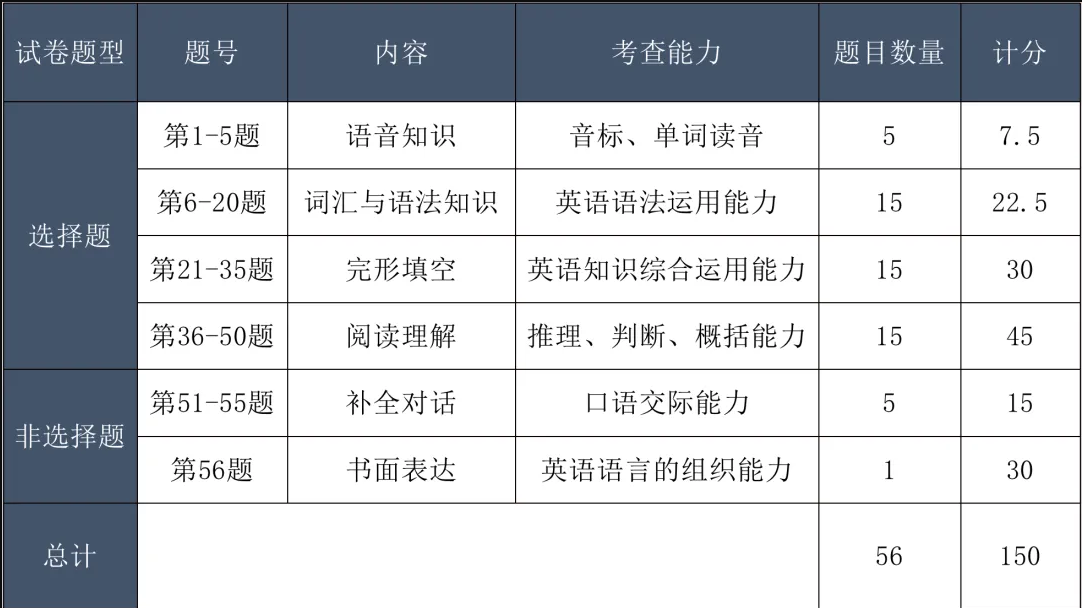 (本科)选择题110分+填空题15分+作文25分=150分。
