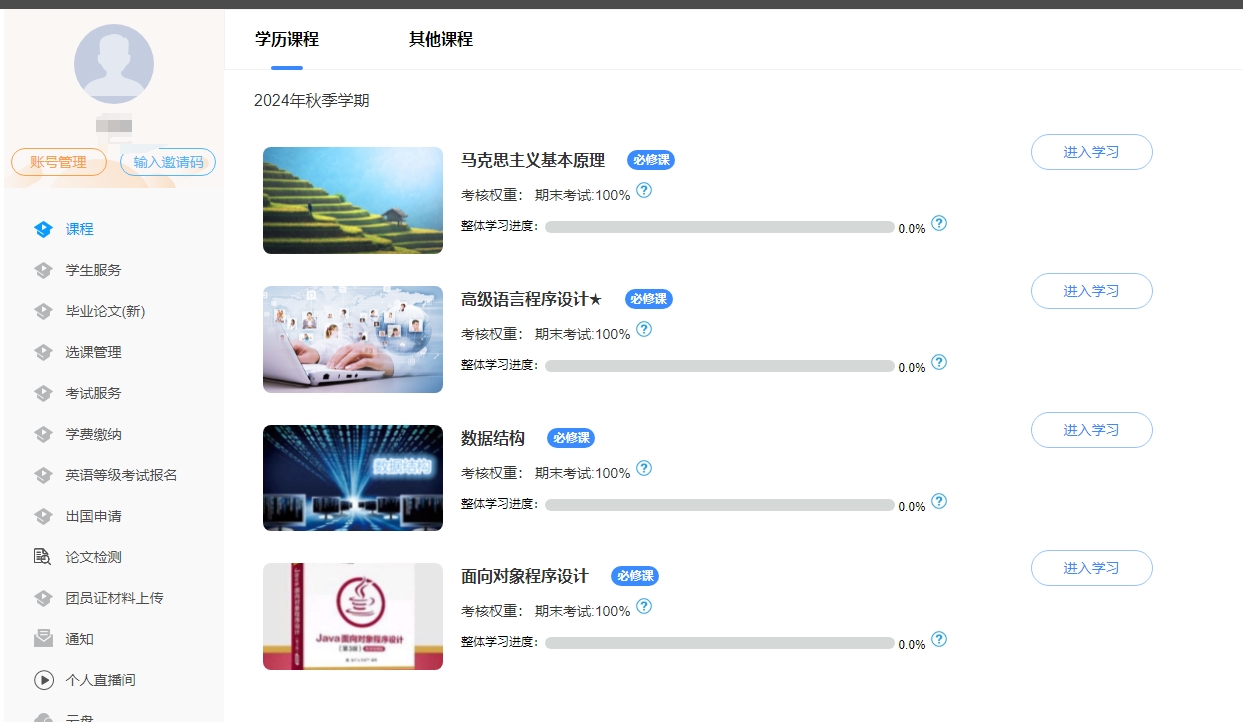 3.本学期成绩总分比为:听课50%+考试50%(平台听课很重要,直接影响该课的总成绩,请务必在截止时间前完成!)