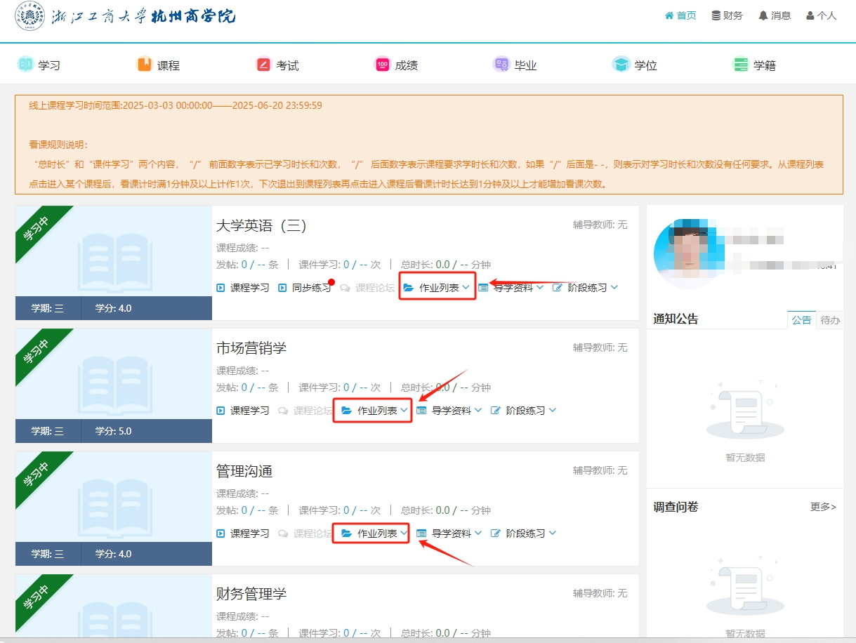 2、请各位学生在规定时间内完成学习、作业等,未在规定时间内完成学习,将影响平时学习分数。