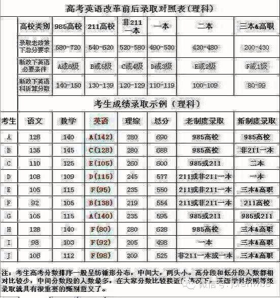 所以,对于直接受政策影响的14级新高一学生家长而言,一定要提早规划。当然,不管怎么变化,对这一届学生整体而言都是公平的。毕竟新高一大家又站在了同一条起跑线上。家长一定要看,英语虽然不参加统一高考,但是将采取等级录取家长一定要看。最近很多人问的、英语学科虽然不参加统一高考,但是将采取等级录取,假如你总分考了500分,其中英语90分,按照高考老的制度,你依然可以报一本。但是这样改革后,如果你英语90分,只达到F,那么你选择的院校可能只是三本了!一些家长误以为高考不考英语了,这是错误的,只是英语考试的方向改变了!更加注重语言的实际应用和听说能力!不要因为一时的误解迷惑而耽误了孩子的未来!