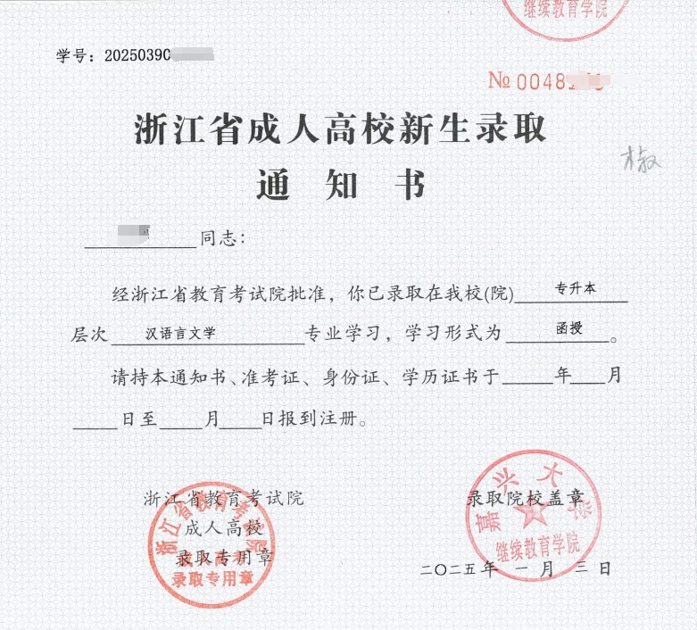 祝贺你!经浙江省教育考试院批准,你已被嘉兴大学录取为高等学历继续教育2025级新生。你收到《录取通知书》,只表明取得了入学资格,新生必须报到并缴费,经嘉兴大学继续教育学院入学资格复查合格,并经教育部学信网上新生学籍电子注册才取得正式学籍。如你在规定时间内学完所读专业人才培养方案规定的全部课程,成绩合格,可获得嘉兴大学毕业证书,教育部学历电子注册,国家承认学历。本科毕业生达到学校学历继续教育学士学位授予条件者可授予学士学位。为做好 2025年新生报到入学工作,现将有关事项通知如下: