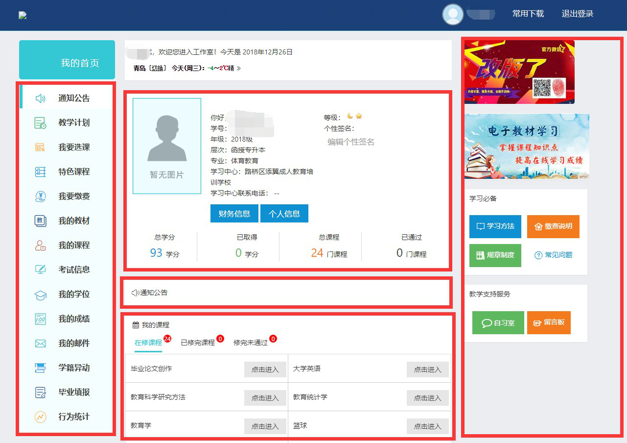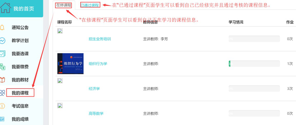 左侧为导航栏,点击 “我的课程”页面,在“在修课程”页面中显示当前学生所学习的课程信息,且对所有课程进行学习均从此课程列表中点击进入;