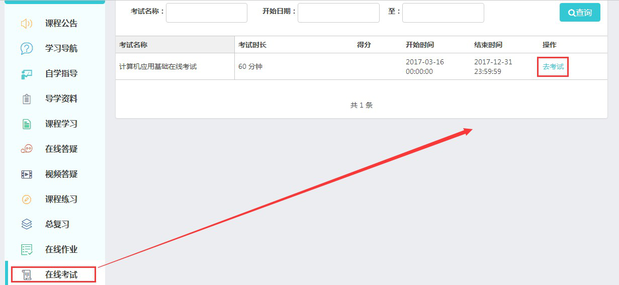 1、点击课程名称“物权法”,→点击“在线考试”去考试