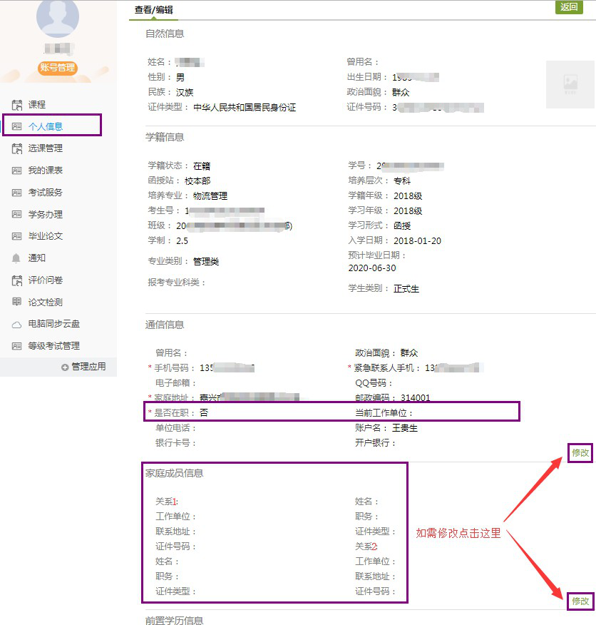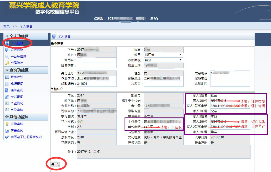 3. 在“学籍信息”栏里,按以下要求填写:“单位电话”字段:填写“非在职”(指学生本人) “家人单位 1”字段:填写“居民身份证”(适用身份证信息) “家人 1 联系电话”字段:填写身份证号。“家人 2 单位”字段和“家人 2 联系电话”字段以此类推。