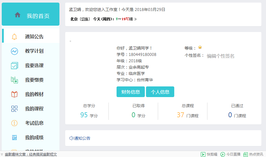 开学了!4月1日起:丽水学院成人教育2019级(第一学期)新生学习平台已经开通,即日起学生可登录学院网络授课平台:http://lsxy.zhaomingedu.cn/portal/home.aspx