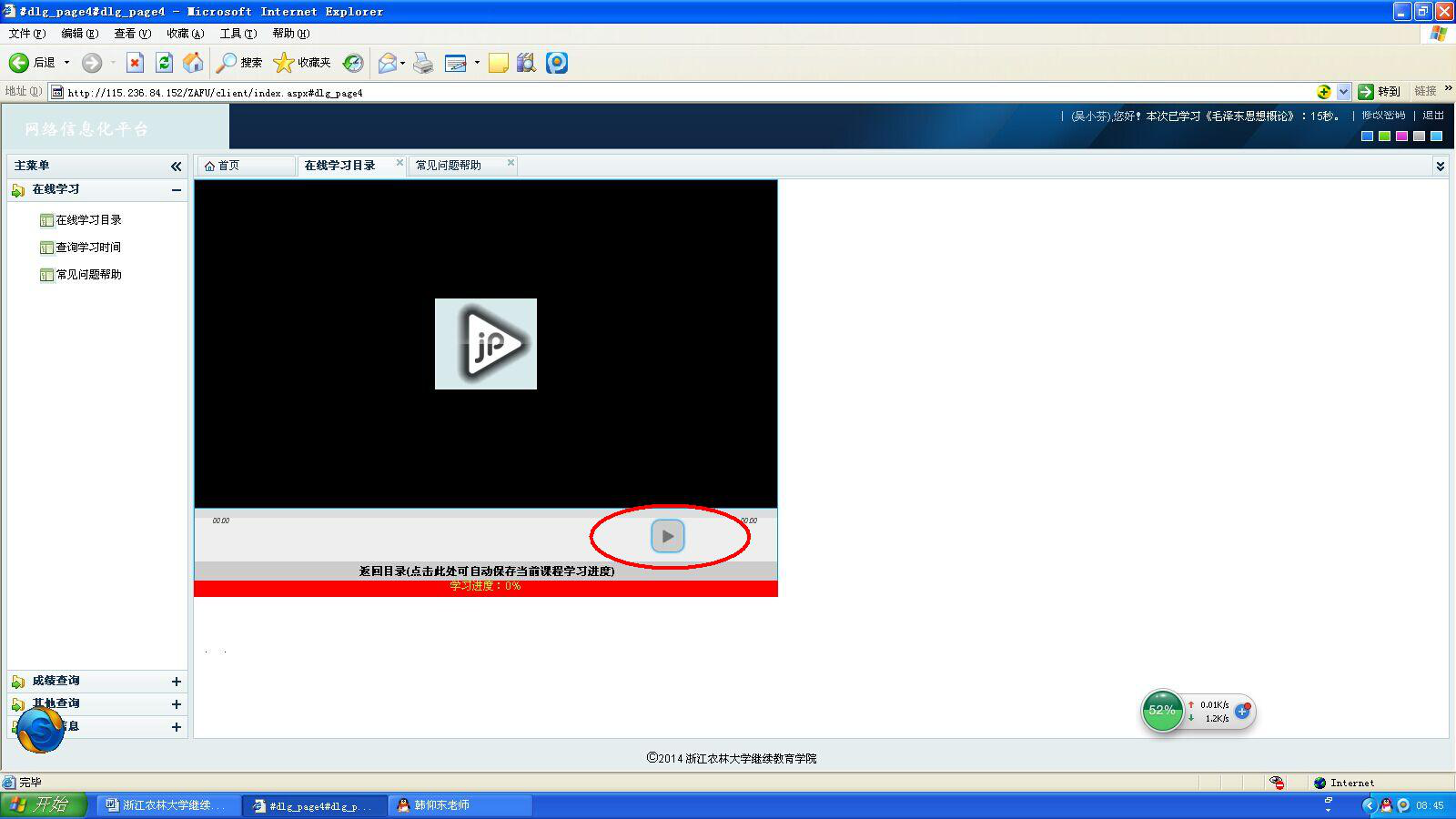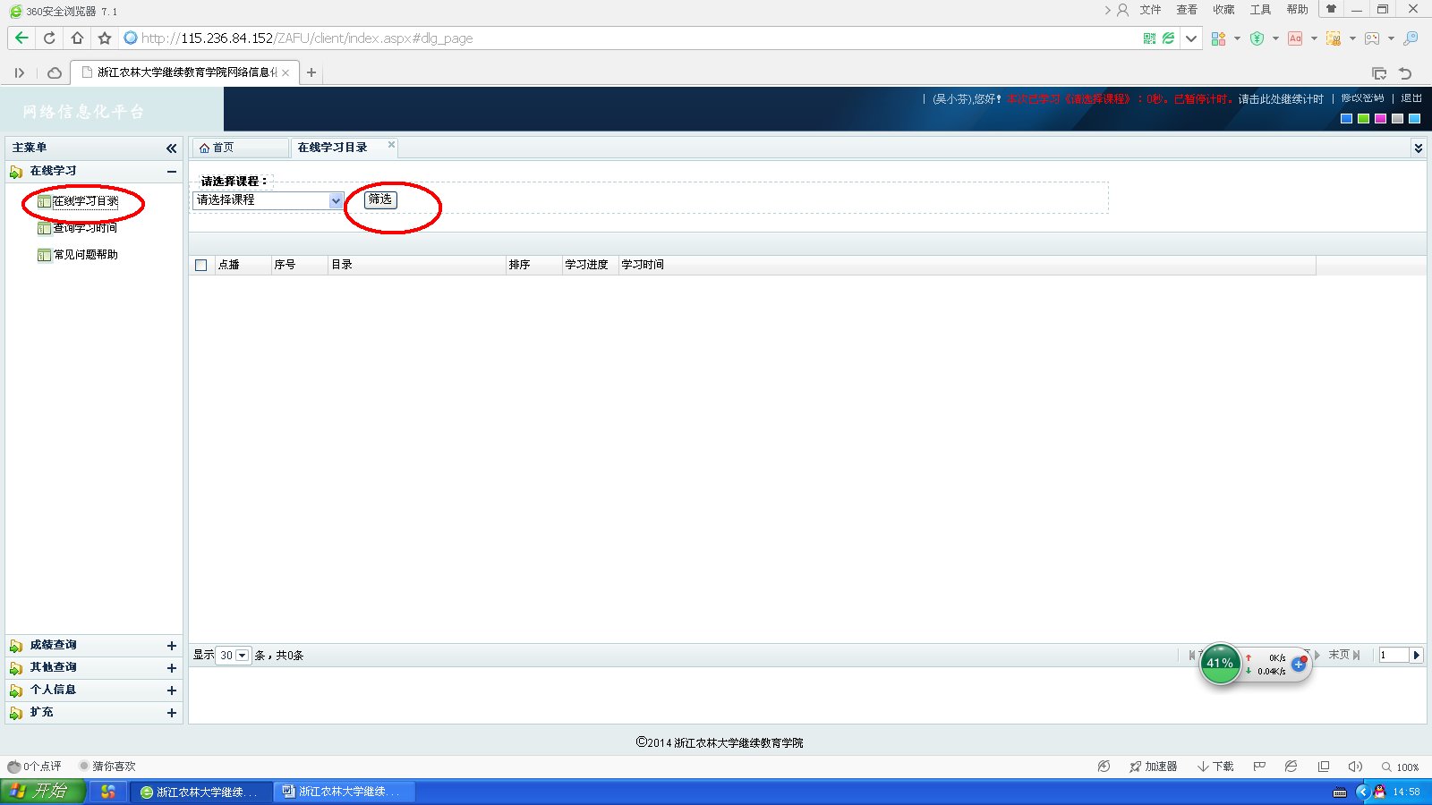 3.在线学习:登录后, 点击在线学习目录,选择课程,点击筛选,弹出该课程所涉及的全部课件,点击点播按钮,进入在线学习界面(注:系统接收到您点播放信息后,需从缓冲区调取视频数据,此操作需花费30-60秒时间,请学员耐心等待)。本系统已设置防作弊功能,请各学员认真学习。如在学习过程中因打开多个活动界面或拉动学习进度导致的不计时情况,责任自负。