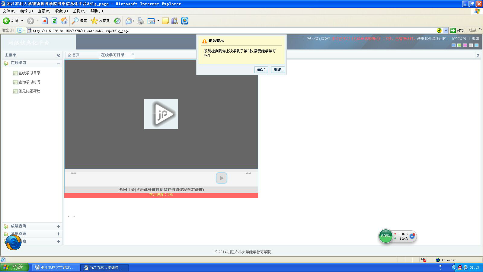 5. 补充说明(1)章节学习过程中,中途结束本章节学习,请按照第2页中所述的“安全退出”操作执行。下次想继续学习本章节内容时,在选择本章节后,系统会自动弹出下图所示界面,点击确定按钮,自动转至上一阶段学习点,继续学习,反之,对本章节内容从起始点开始,重新学习。