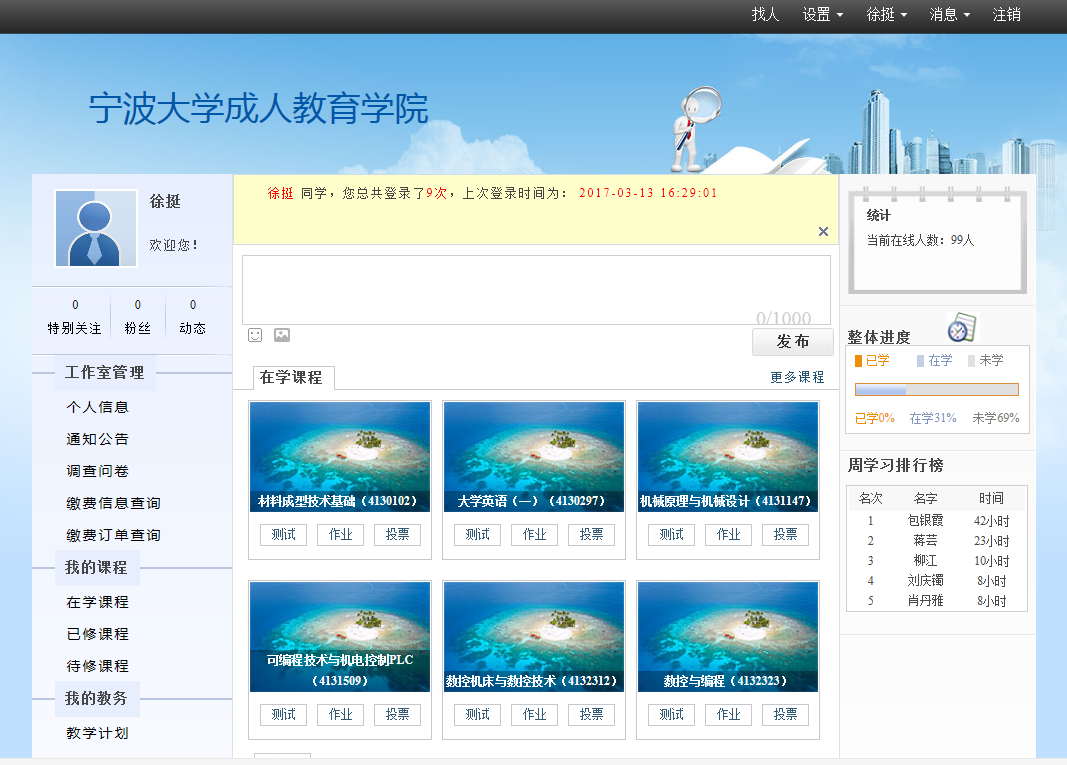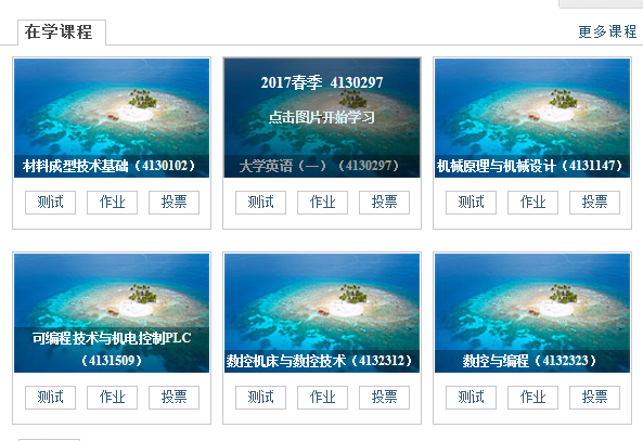 3.登录后,显示学生工作室,默认显示6门部分在学课程,如果有更多的课程可以点击更多课程湖综合直接点击我的课程下的在学课程进行查看