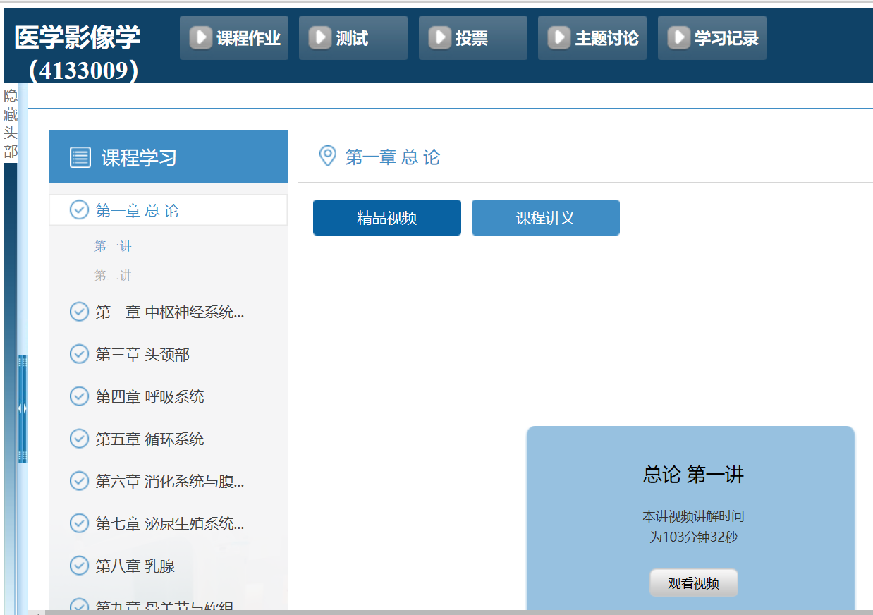 五、课件界面如图,可以进行课程作业、测试、投票、主题讨论和学习记录等操作;