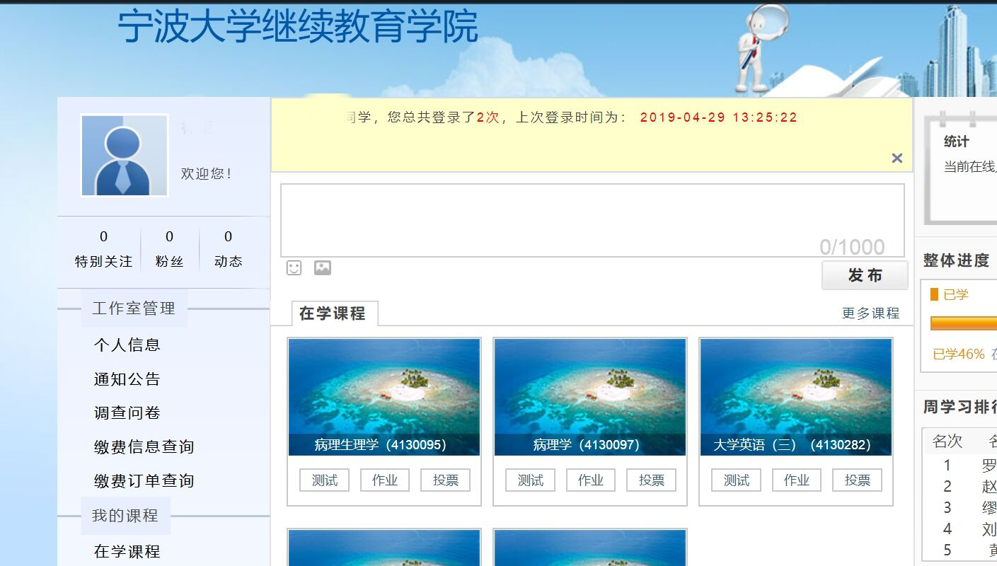 登录后,显示学生工作室,默认显示部分在学课程,如果有更多的课程可以点击更多课程或者直接点击我的课程下的在学课程进行查看;