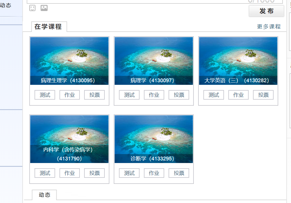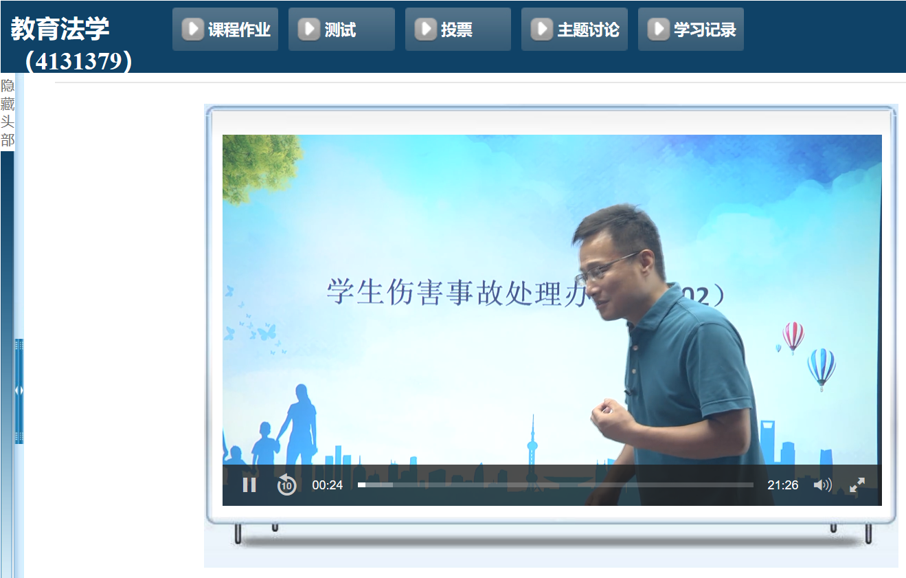 课件界面如图,可以进行课程作业、测试、投票、主题讨论和学习记录等操作;