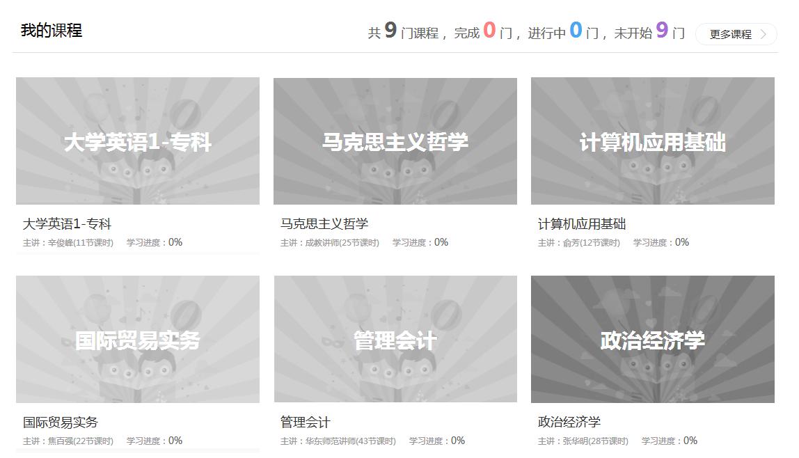 1)我的课程里可在列表中选择学习的课程,还可以显示学习进度和总学习时长。也可以直接首页点击课程,选择对应的学期进行学习;